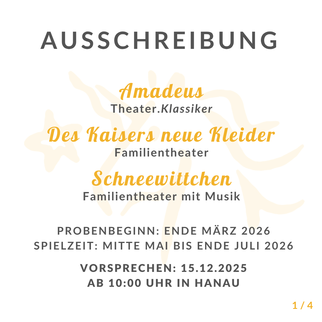 Für die Produktionen "Amadeus", "Des Kaisers neue Kleider" und "Schneewittchen" im Rahmen der Brüder Grimm Festspiele 2026 sind noch verschiedene Rollen zu besetzen.