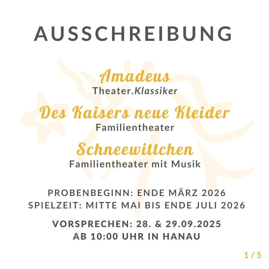 Für die Produktionen "Amadeus", "Des Kaisers neue Kleider" und "Schneewittchen" im Rahmen der Brüder Grimm Festspiele 2026 sind verschiedene Rollen zu besetzen.